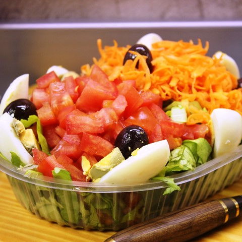 Lechuga, tomate, zanahoria, arvejas y huevo.