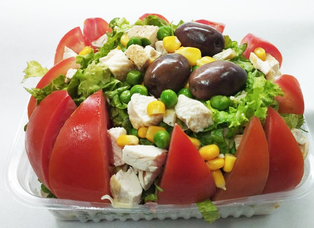 Arroz blanco, lechuga, tomate, arvejas, choclo y pollo.