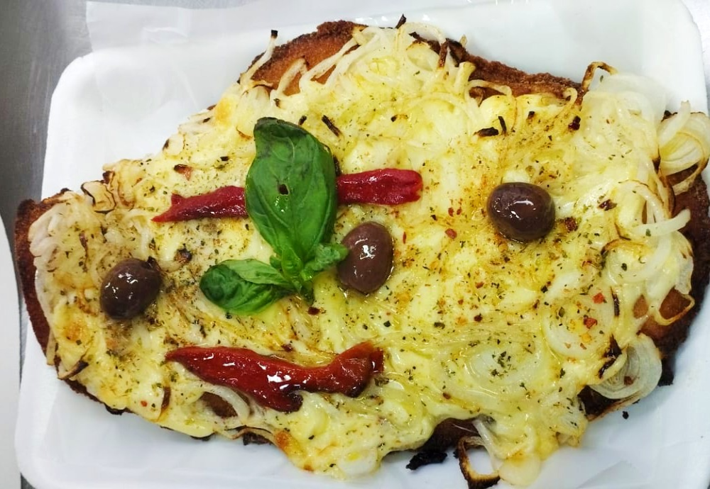 Muzzarella, cebolla, oliva y aceitunas negras.