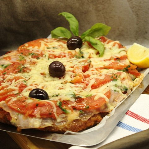 Salsa de tomate, jamón, muzzarella, rodajas de tomate, queso parmesano y aceitunas.