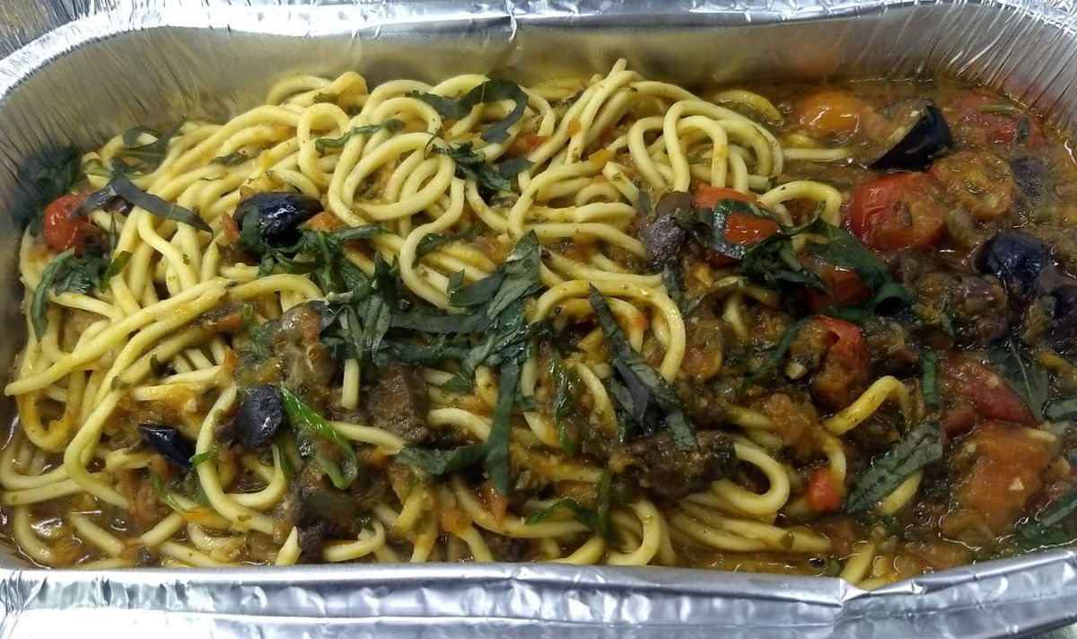 Fideos spaguettis salteados con oliva, cebolla de verdeo, tomate, albahaca fresca, aceitunas negras, salsa de soja y salsa fileto.