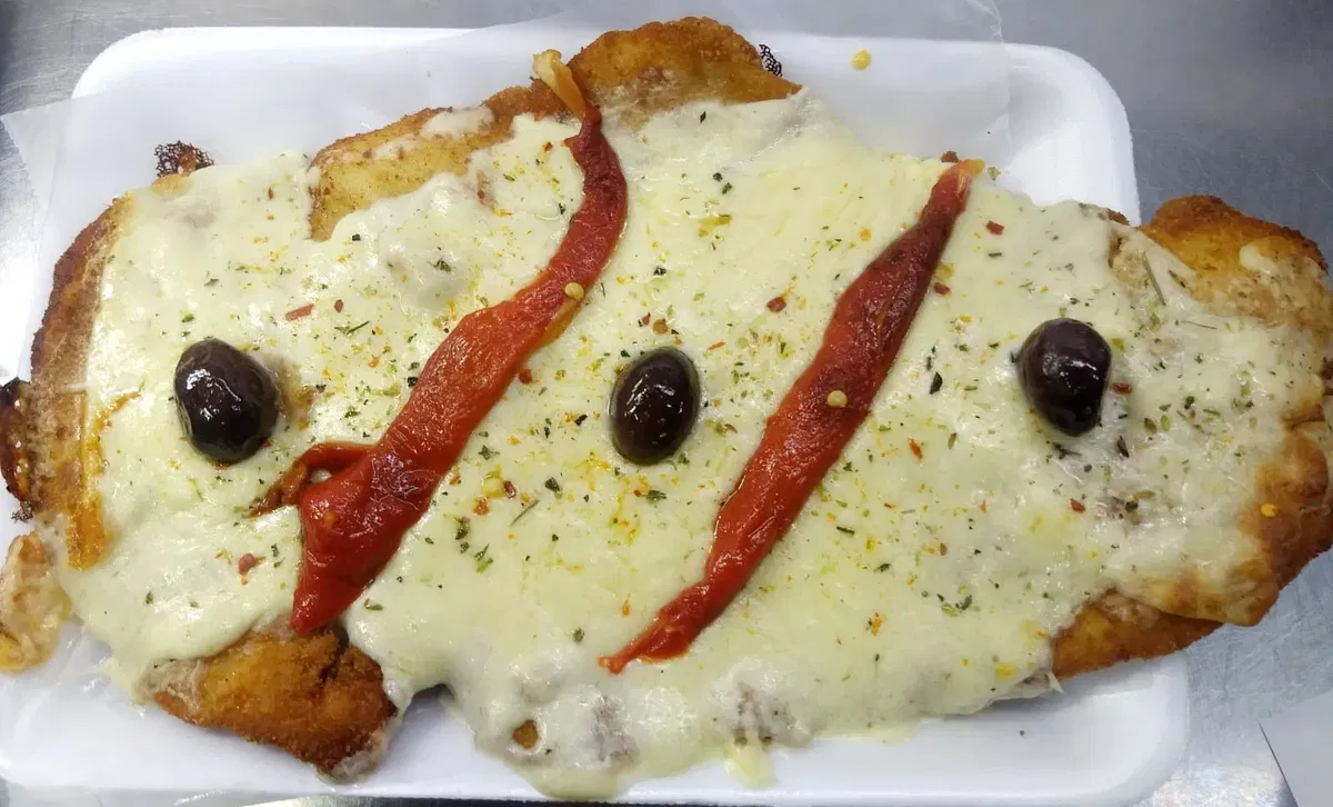 Milanesa de suprema a la pizza, Salsa de tomate, muzzarella y aceitunas.