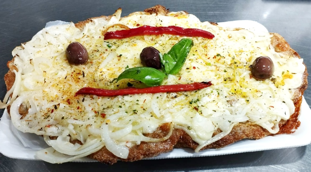 Muzzarella, cebolla, oliva y aceitunas negras.