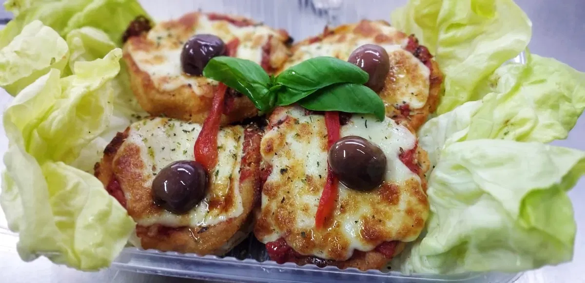 Milanesas de calabaza (a la pizza, Napolitana o fugazetta), acompañada por ravioles integrales o de masa de espinaca, con aceite de oliva y parmesano.